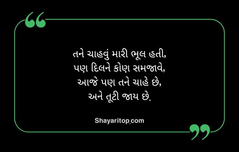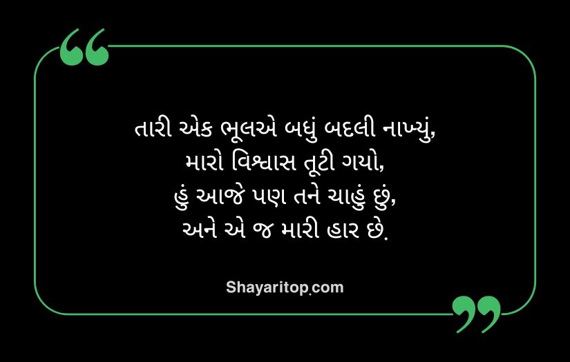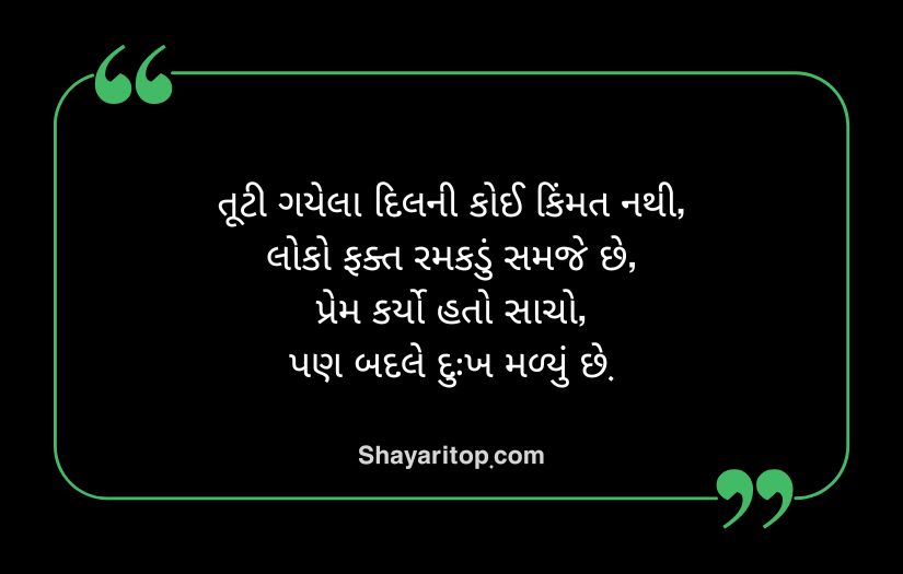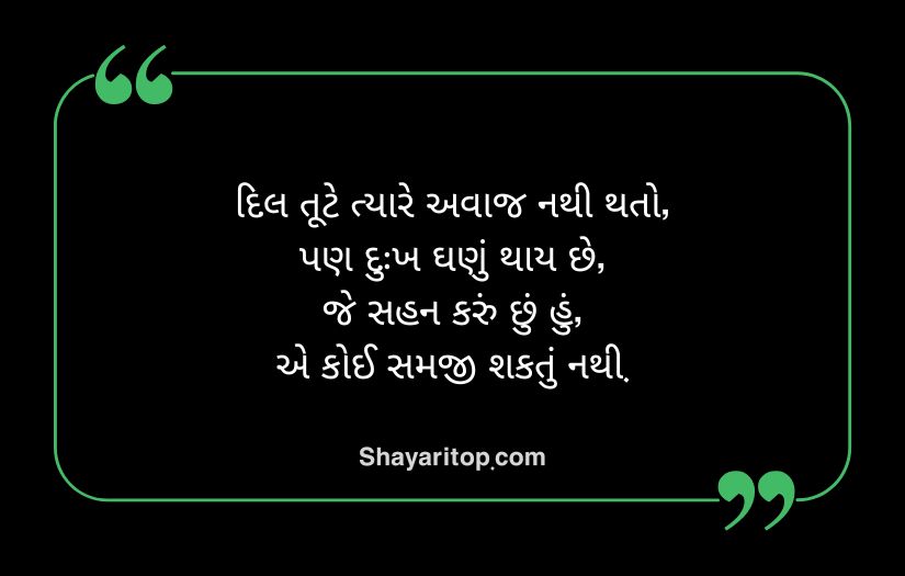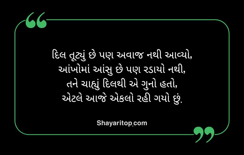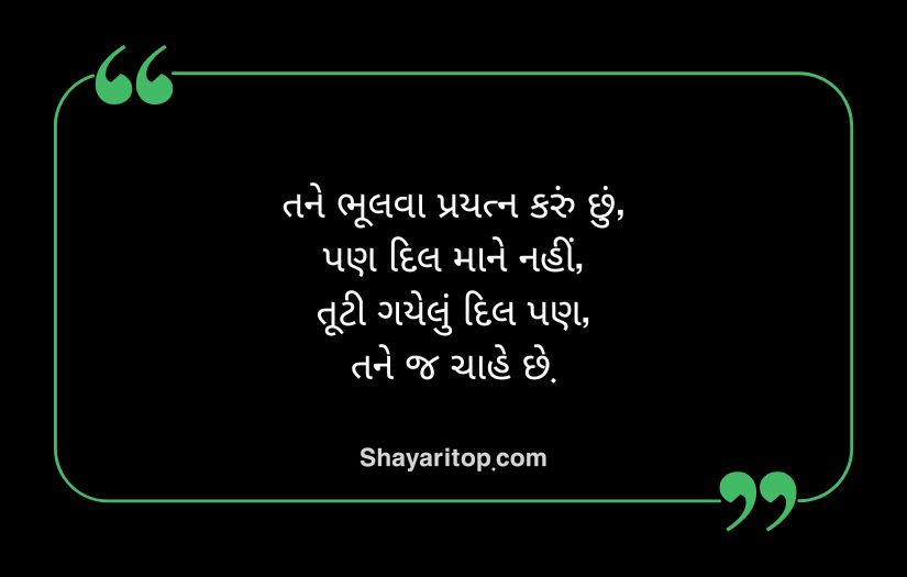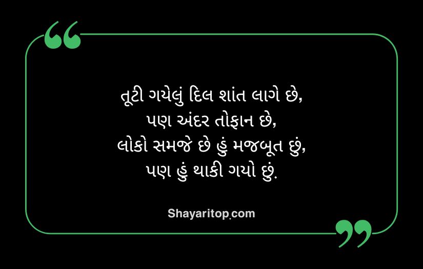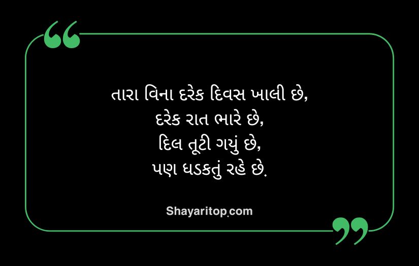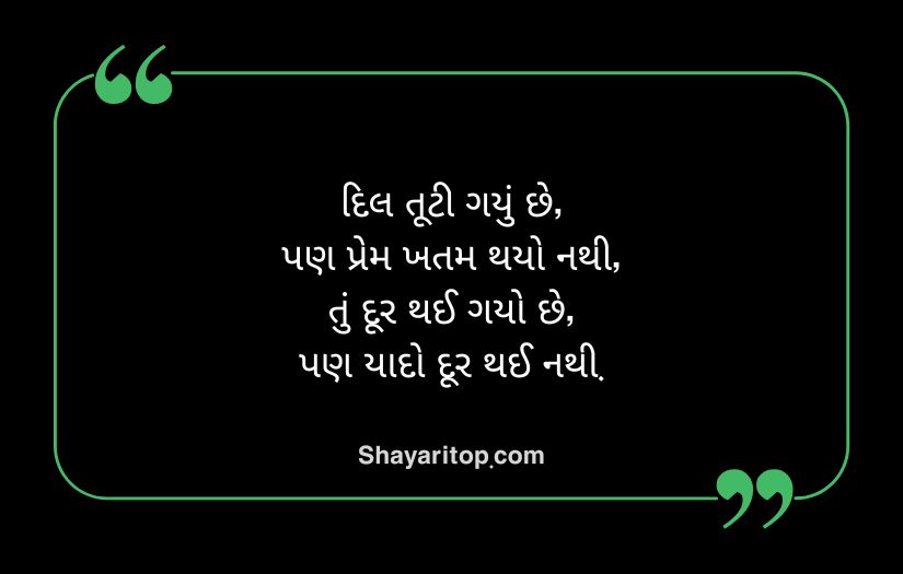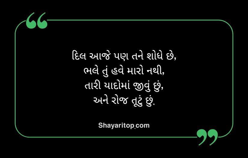 Broken heart shayari in Gujarati expresses the deep pain, longing, and emotional struggle that comes with heartbreak. Inspired by poets like Mirza Ghalib, Jaun Elia, and Rumi, this form of shayari presents the feelings of love lost, betrayal, and separation in a heartfelt way. It reflects how love can leave both beautiful memories and painful scars.