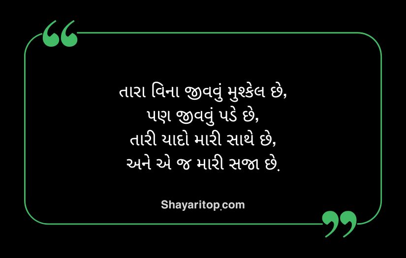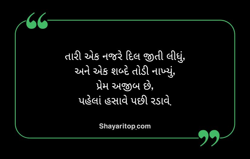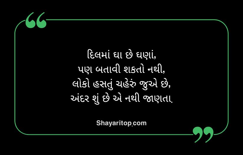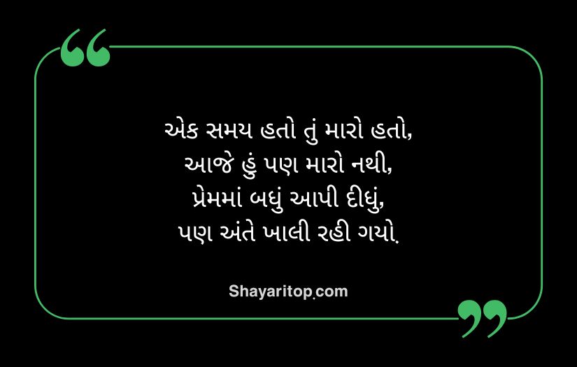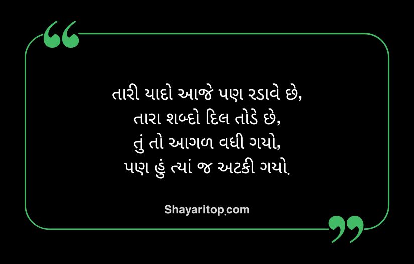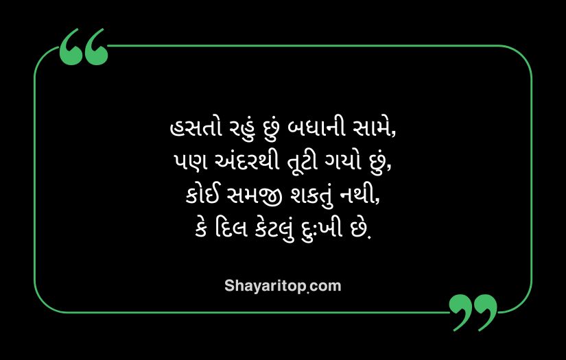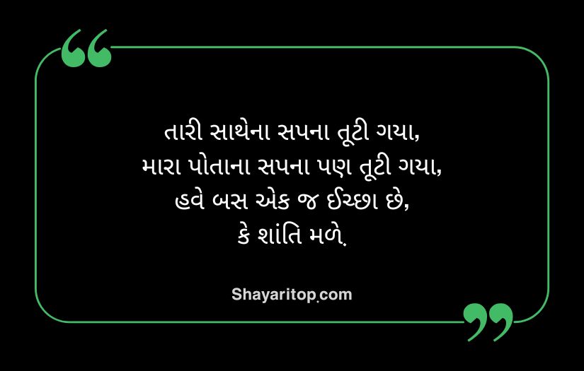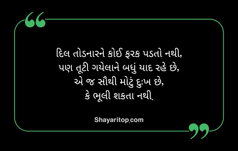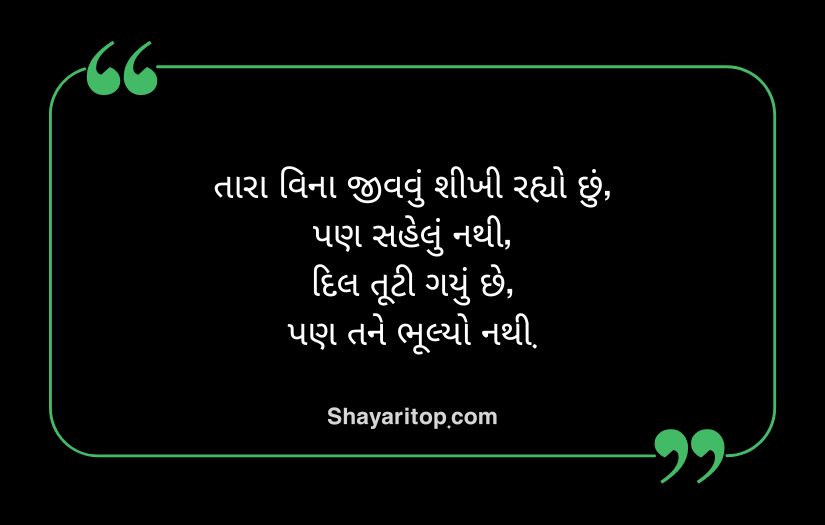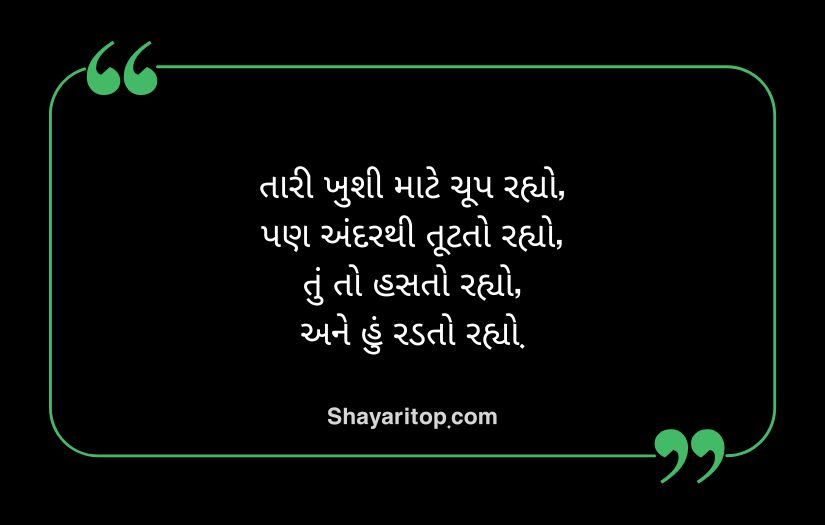 Broken heart shayari in Gujarati expresses the deep pain, longing, and emotional struggle that comes with heartbreak. Inspired by poets like Mirza Ghalib, Jaun Elia, and Rumi, this form of shayari presents the feelings of love lost, betrayal, and separation in a heartfelt way. It reflects how love can leave both beautiful memories and painful scars.